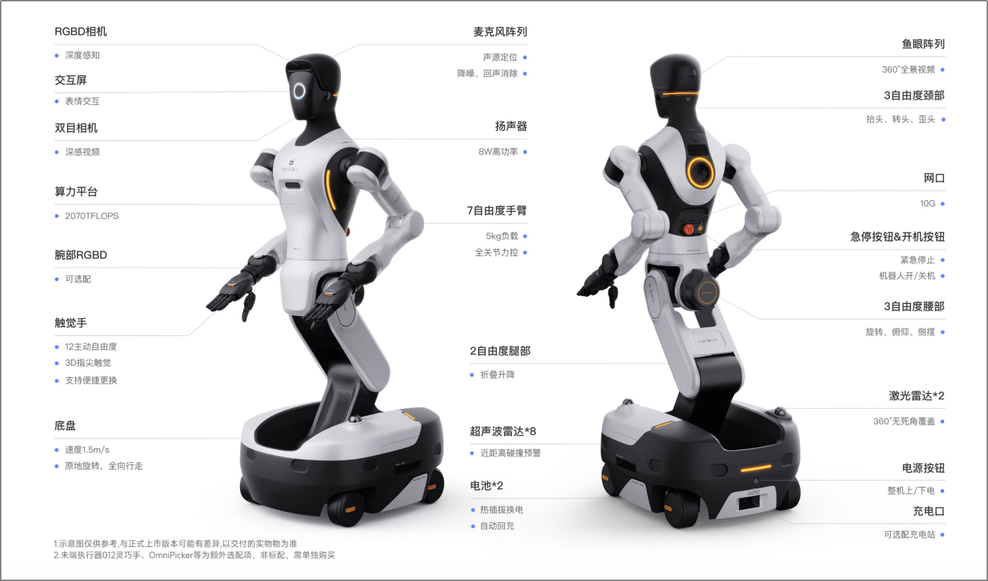 此外,机械臂的每个关节均配备力矩传感器,具备阻断节制能力,从而更好地顺应工业中插接类等需要和婉节制的功课场景。2)腰部布局同样送来严沉升级:G1仅具备单一度的起落俯仰功能,G2则扩展至三个度,支撑平面扭转、前后哈腰取摆布摆动。这不只加强了机械人的矫捷性——例如无需动弹底盘即可通过快速转腰操做两侧货架,还扩大了其工做空间,正在导览或取物时可通过腰部摆动延长触及范畴。别的,下肢采用可折叠构型,使零件布局更为紧凑,便于运输取包拆。
